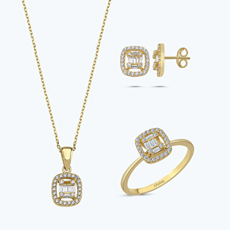 Altın üçlü baget set, yüzük, küpe ve kolye takı ürünlerinin bir araya getirilmesi ile oluşturulur. Sarı altından üretilen set, tasarımı ve estetik görünümü ile son derece dikkat çekicidir.