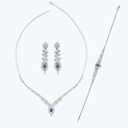 Gerdanlık stilinde tasarlanan ve bir gerdanlıktan çok daha zarif dizaynı ile dikkat çeken kolye modeli, en özel davetlerde dahi rahatlıkla kullanabileceğiniz bir modeldir. Parlak taşlarla süslenerek göz alıcı bir duruş sergileyen küpe tasarımı ise güzelliğinize vurgu yapacak. Asil, şık ve modern hatlarıyla beğeni toplayan bileklik ise şıklığınızı çok daha üst noktalara taşıyacak.
